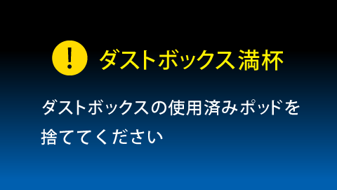 液晶画面に【ダストボックス満杯】が出ていませんか ?![]() | ダストボックス内の使用済みポッドを捨ててください ![]() 使用済みポッドを捨てても【ダストボックス満杯】が消えない場合、検知センサーが汚れている可能性があります かたく絞ったふきんで検知センサーを拭いてください ![]() | P.18 |