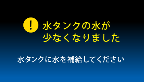 液晶画面に【水タンクの水が少なくなりました】が出ていませんか ?![]() | 【タンク式】 水タンクの水が不足しています 水を補給してください 【水道直結式】 ・水道の元栓が開いていますか? ⇒ 元栓を開けてください ・外付けポンプの電源が入っていますか? ⇒ 外付けポンプの電源を入れてください。 ・浄水器を使用されている場合、浄水カートリッジが目詰まりしていませんか? ⇒ 浄水カートリッジを交換してください ※交換の際は営業担当へご相談ください | ─ |