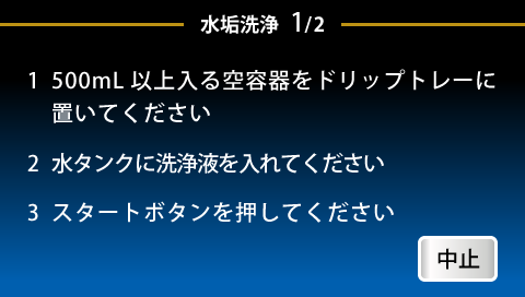 | 定期的に水垢洗浄を行っていますか? 本体内部部品にカルキ(水垢)が詰まっている可能性があります | ユーザーモードより水垢洗浄(クエン酸洗浄)を行ってください ※改善しない場合は、すすぎを数回繰り返してください ※900杯毎にクエン酸による水垢洗浄を推奨しています ![]() | P.15 |