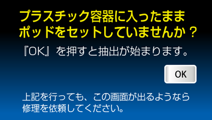 | E-005 | 抽出ヘッド昇降機 下降故障 ※E005は表示されず「プラスチック容器に入ったままポッドをセットしていませんか?」の画面が表示されます。 ![]() | ・ポッドホルダーが正しく取り付けられていますか? ・イジェクションピックが折れていませんか? 折れたイジェクションピックが引き出しに干渉したり引っかかっていませんか? ⇒ 営業担当へご相談いただき修理依頼してください ![]() ※プラスチック容器入りのポッドをマシンに無理やりセットし抽出動作を行うとイジェクションピックが折れることがありますので、必ずポッドはプラスチック容器から取り出し、 不織布製のポッドだけをマシンにセットしてください ![]() 引き出しが開かない場合は、無理に取り出さず、電源OFF→ON(再起動)してみてください ※無理に取り出すとピックが折れます 部品が破損している可能性がありますので、営業担当へご相談いただき修理依頼してください | ─ |