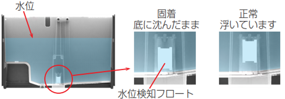 | 水タンクに水が入っている状態で白く四角い浮き(水位検知フロート)が沈んだままになっていませんか? 水垢が発生していませんか? ![]() | 水垢でフロートが固着していますので、細長い棒でフロートを動かしてください また、洗剤等で掃除してください | ─ |