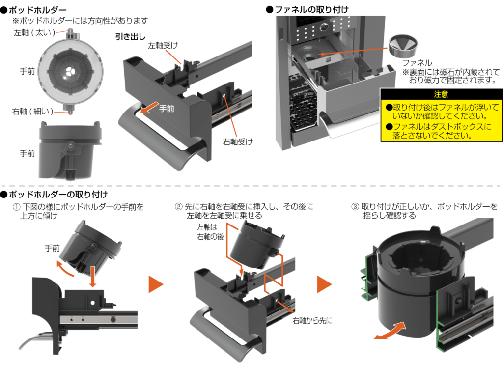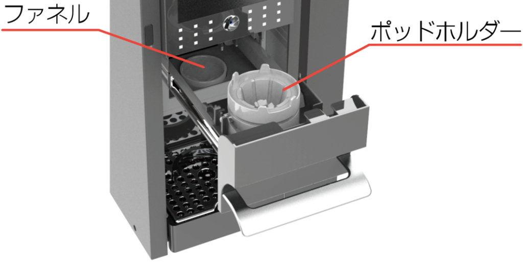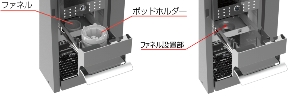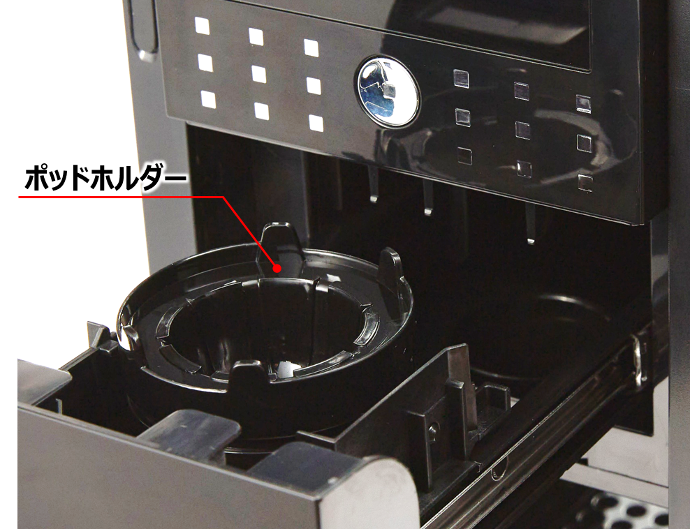 | ポッドホルダーやファネルが汚れていませんか? ファネル設置部や抽出口周辺が汚れていませんか? ![]() | ポッドホルダーやファネル、マシンの清掃をお願いします 抽出部、引き出し内、ファネルはめ込み部分など ![]() | P.18 |