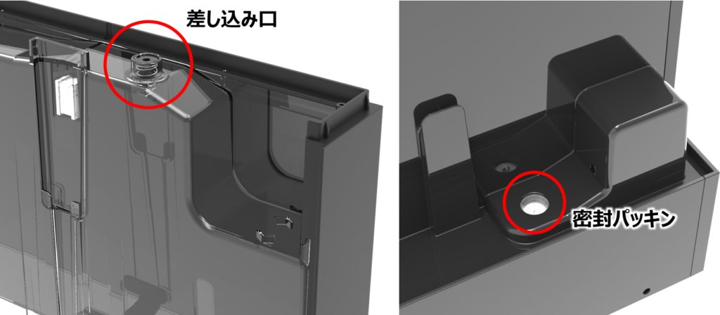 | 【タンク周辺からの水漏れ】※着脱タンク式のみ タンクの差込口が破損していませんか? マシン側のタンクの出水口が挿入される部分の密封パッキンに異物がついていたり、密封パッキンが破れていませんか? | タンクの不具合:営業担当へご相談いただきタンクを購入してください マシン側の不具合:営業担当へご相談いただき修理依頼してください ![]() | ─ |