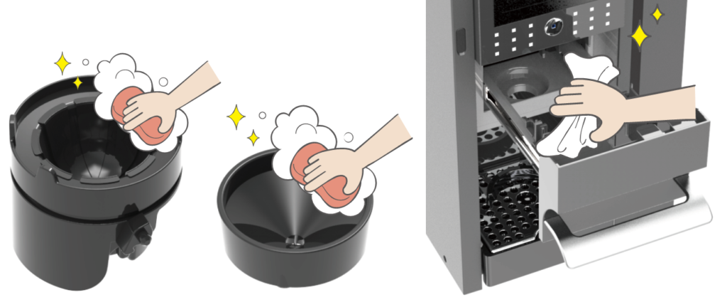 お手入れは簡単で、ポッドホルダー、ドリップトレー、水タンクを水洗いするだけです。