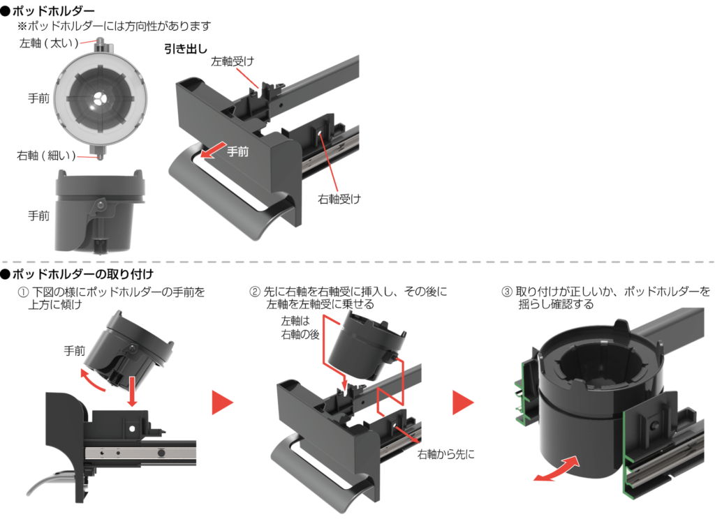 | 【抽出口周辺からの水漏れ】 ポッドホルダーが正しく取り付けられていますか? ![]() | ポッドホルダーを正しく取り付けてください![]() | P.6 |