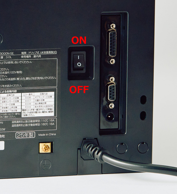 | E-003 | ヒーターまたは温度センサーの故障 | 電源スイッチをOFF→ON(再起動)していただき、エラーが消えるようでしたら、継続してご使用ください 電源スイッチをOFF→ON(再起動)してもエラーが再発するようでしたら、部品が破損している可能性があります ⇒ 営業担当へご相談いただき修理依頼してください | ─ |
