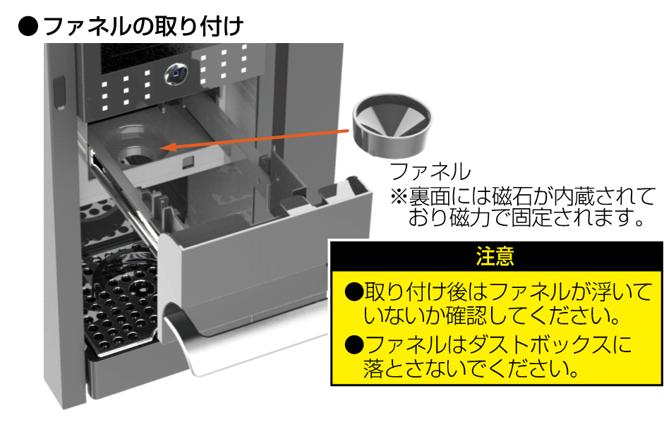 | ファネルが斜めに傾いてセットされていませんか? ファネルを紛失していませんか? ![]() | ファネルが水平になるようにセットしてください 紛失された場合は、営業担当へご相談してください ![]() | P.6 |