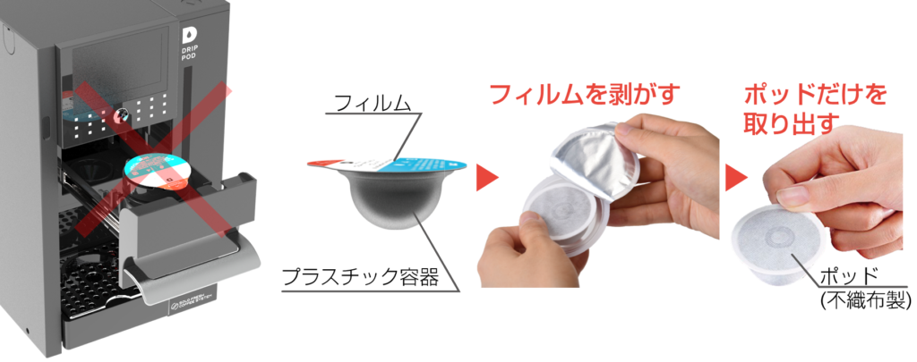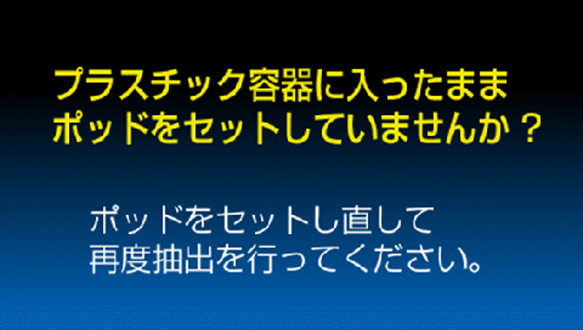 | プラスチック容器入りのままポッドをマシンにセットしていませんか? (ダストボックス内にプラスチック容器入りのポッドが落ちていませんか?) ![]() | 必ずポッドはプラスチック容器から取り出し、不織布製のポッドだけをマシンにセットしてください 【ご注意】 プラスチック容器入りのポッドをマシンに無理やりセットし抽出動作を行うと内部部品の損傷に繋がります ![]() | P.11 |