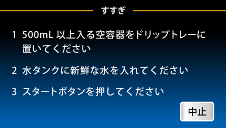 | 初めてのご使用ですか? | 抽出口よりお湯が出るまで、ユーザーモードより「すすぎ」を繰り返してください![]() ※ポンプに空気が入り込み吸い上げできない時があり、すすぎを繰り返すことで抽出できます | P.14 |