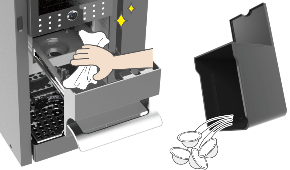 | 引き出しのレールにコーヒー・カルキが固まって付着していませんか? | コーヒー・カルキを可能な範囲でふき取ってください 食品機械用グリースをレールに塗布して、引き出し開け閉めを繰り返してください ⇒改善しない場合は、営業担当へご相談いただき、修理依頼してください 【末永くご使用いただくために】 定期的に清掃していただき、ダストボックス内の使用済みポッドをこまめに廃棄してください ![]() | P.18 |