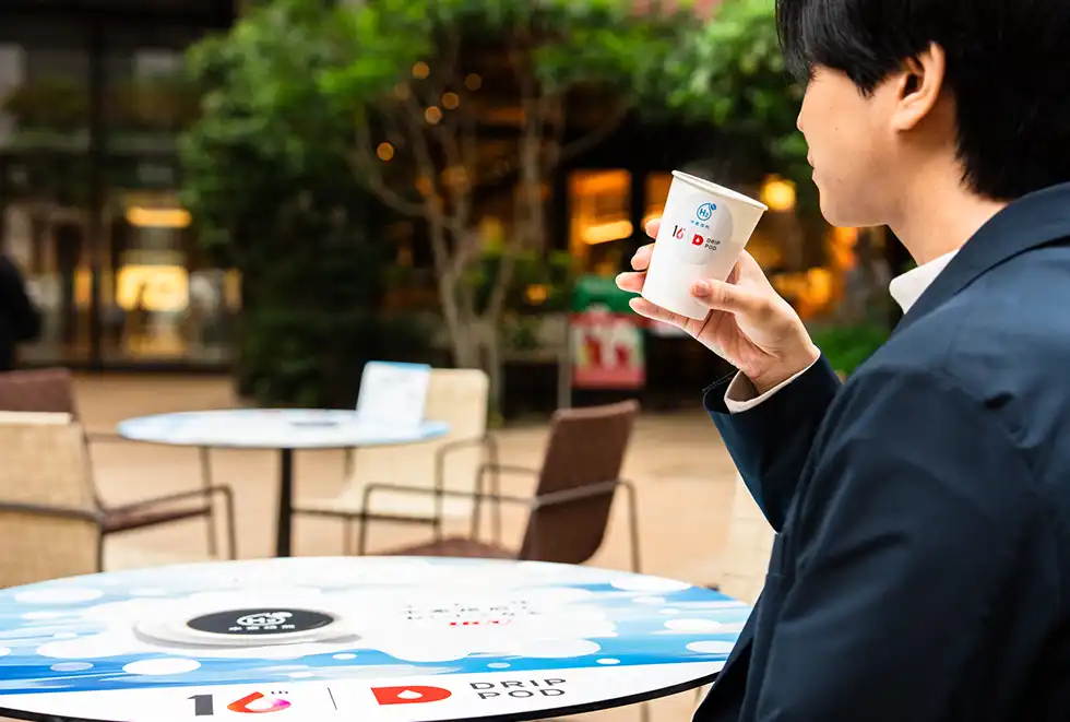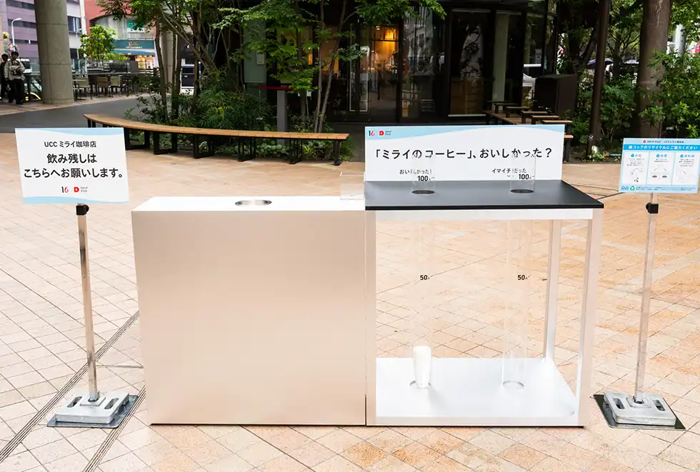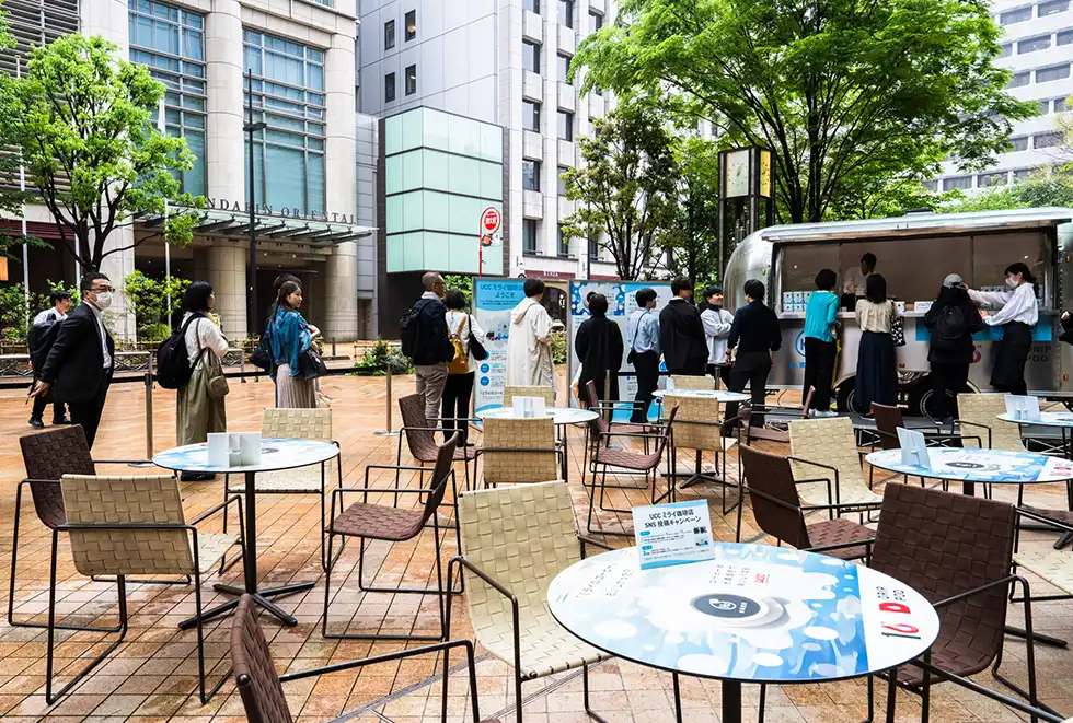 東京・日本橋のCOREDO室町テラス1階・大屋根広場で2025年4月23日、「UCCミライ珈琲店」が開催された。UCCドリップポッド10周年企画の一環として、“水素焙煎コーヒー”を無料で試飲できる1日限定のイベントに、買い物客や周辺のオフィスワーカーが集まった。