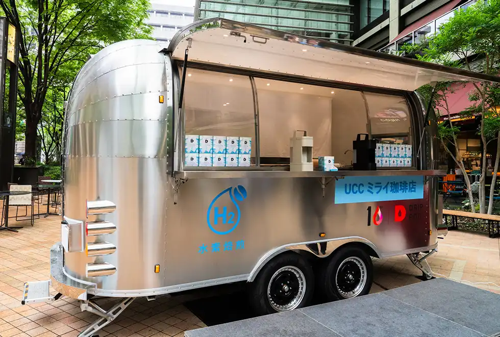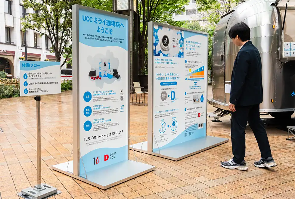 参加者は水素焙煎コーヒーを紹介するパネルを見たあと、キッチンカーで簡単なクイズ「今日ご提供する未来のコーヒー、一体なに焙煎のコーヒーでしょう?」という出題に対して、「水素焙煎!」と正解できた参加者は「DRIP POD YOUBI」のスイッチをみずから押してコーヒーを抽出。ドリップポッドの「水素焙煎 イルガチェフェ地方産コーヒー」がホットまたはアイスで提供された。