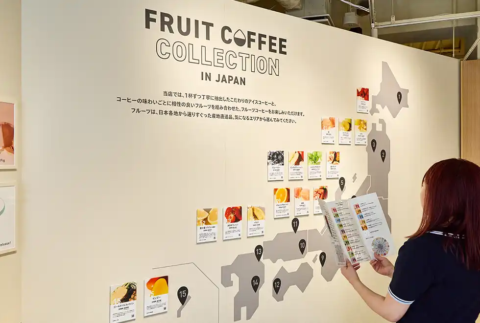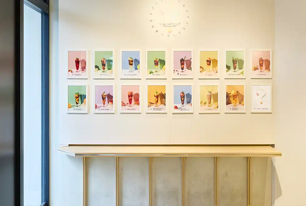 店内には16種類のフルーツのパネルが飾られ、産地名とおいしさの特徴、生産者名が記されている。手元のメニューでは気分やシーンから選ぶこともでき、コーヒーに詳しくない人でも気になるフルーツで選べるよう工夫されている。