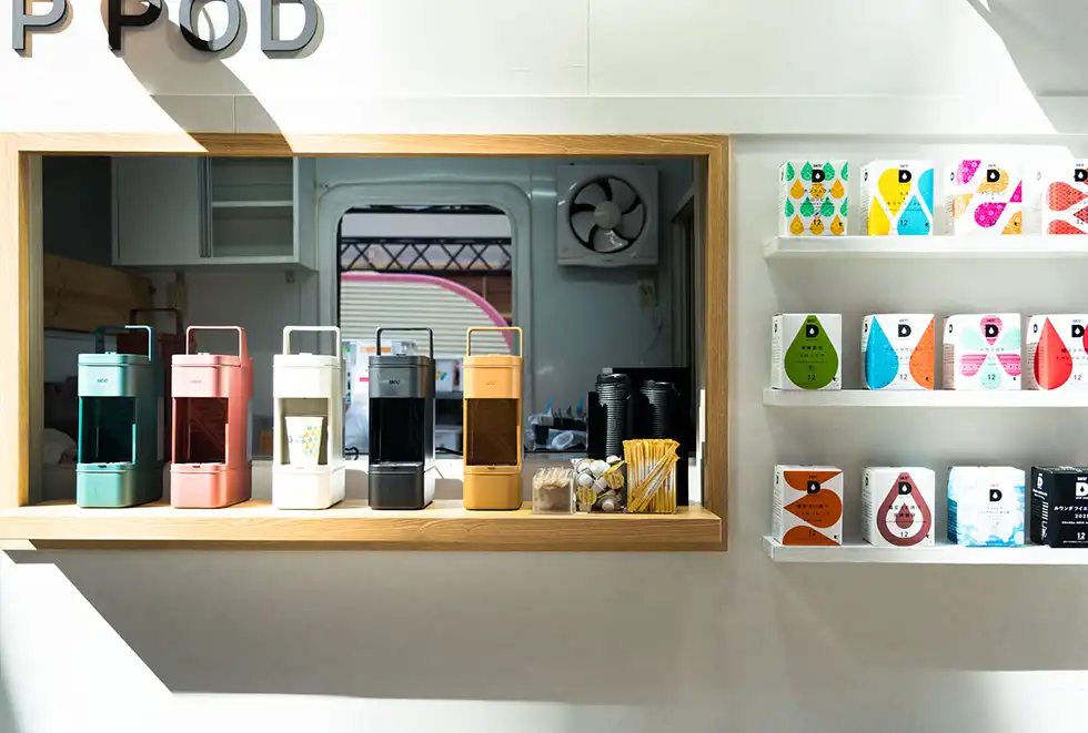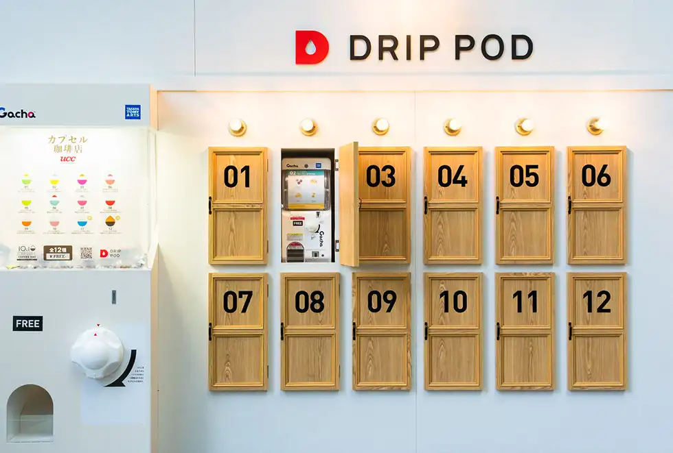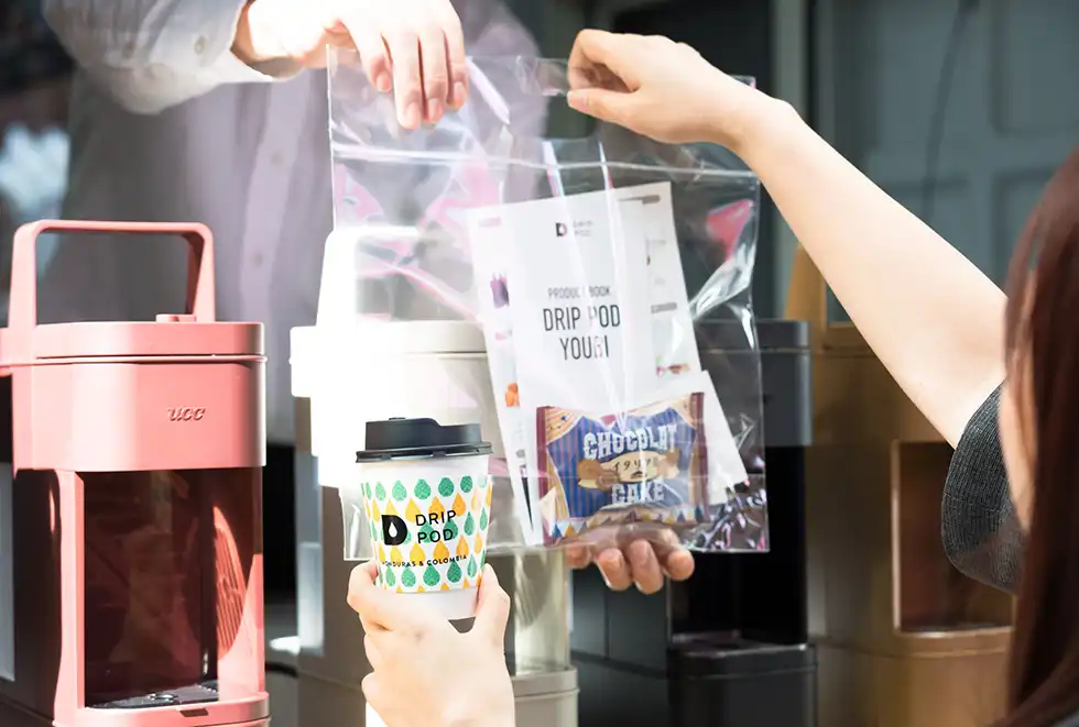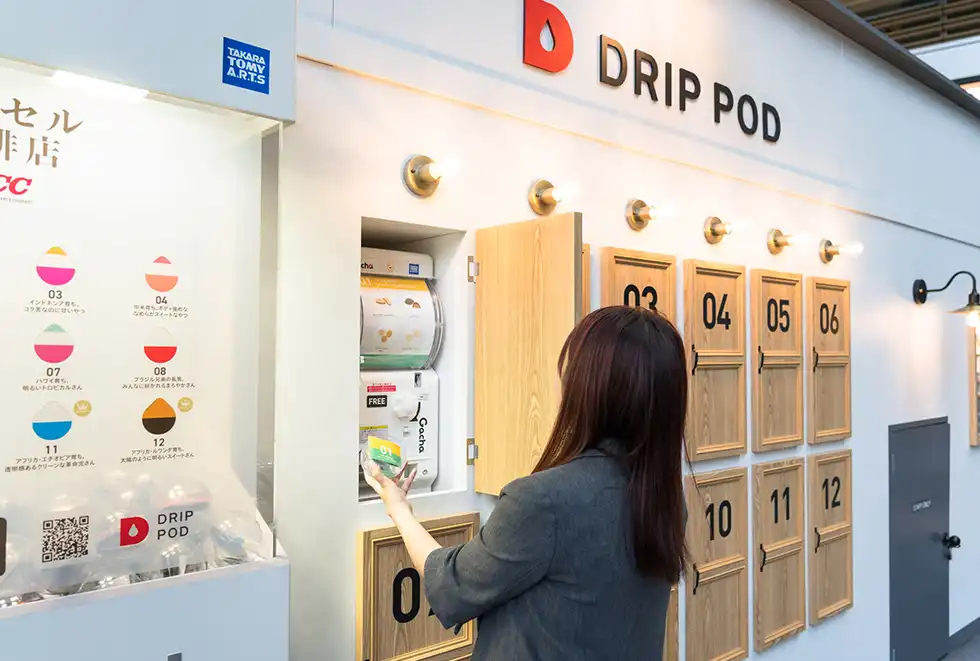 コーヒーのカプセルとお菓子のカプセルを持った参加者は、カプセル式ドリップコーヒーマシン「DRIP POD YOUBI」が並ぶカウンターに移動、プロのハンドドリップ技術を再現した淹れたてのコーヒーを味わうことができる。