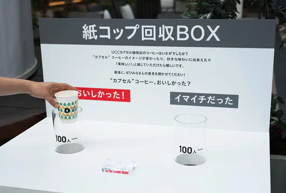 なおコーヒーを楽しんだあとの紙コップは「おいしかった!」「イマイチだった」と2つの選択肢が記載された回収BOXへ。それぞれ自分の満足度に応じて投票する仕組みだ。なお、結果は97%の人が「おいしかった!」と回答。回収後の紙カップは王子ホールディングスによるリサイクルプログラムでペーパータオルにリサイクルされ、今後はドリップポッドのイベントでまた使用されることとなる。