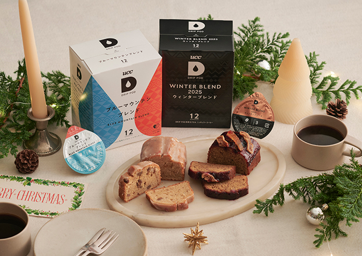 UCC上島珈琲株式会社(本社/兵庫県神戸市、資本金/10億円、社長/芝谷博司、以下UCC)は、“農園からこだわった、まっすぐな一杯”をお届けするカプセル式ドリップコーヒーシステム「ドリップポッド」より、コーヒーのテロワールを味わえる「旅するコーヒーマリアージュ」セットの第11弾を、11月10日(月)よりドリップポッド公式オンラインストアにて150セット限定で予約販売を開始します。今回は「旅するコーヒーマリアージュ」シリーズ初となる2種類のコーヒーと2種類のケーキを組み合わせたセットになっており、コーヒーはスペシャルティコーヒーを使用した『ウィンターブレンド2025』と、コーヒーの王様の名にふさわしい、品格のある味わいが特徴のブルーマウンテンコーヒーを使用した『ブルーマウンテンブレンド』を選定。ケーキにはポップアップストアなどで話題のパティスリー「feuquiage(フキアージュ)」が作る「ケーク・カシスフィグ」と「ケーク・マロングラッセ」とのマリアージュが楽しめます。